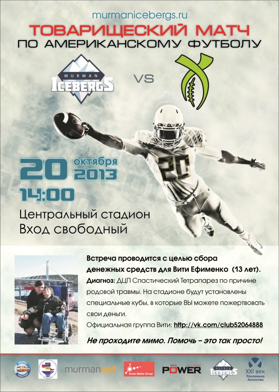 Матч «Мурманские Айсберги» против «Хищники ПетрГУ» будет носить благотворительный характер. Все средства, собранные в ходе игры, будут перечислены на лечение маленького 13 – летнего мальчика Вити Ефименко, который сейчас проходит лечение в Израиле. Его диагноз – ДЦП, спастический тетрапарез по причине родовой травмы.