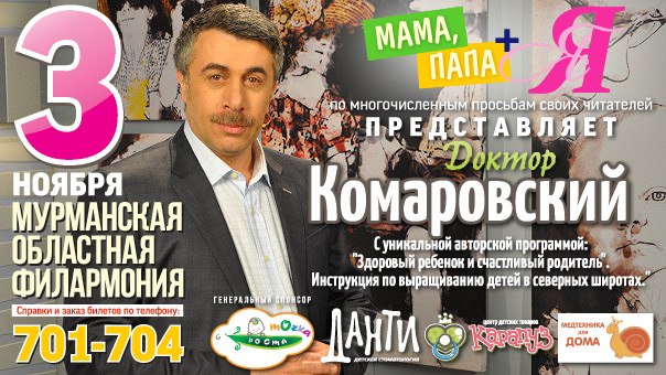 Знаменитый на все СНГ ведущий телевизионной программы «Школа доктора Комаровского» впервые приезжает в Мурманск! По многочисленным просьбам наших горожан в своем плотном лечебно-съемочном графике Евгений Олегович все-таки нашел время, чтобы впервые посетить Заполярье.