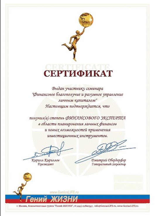 Тренер – Дмитрий Обердерфер – генеральный директор Консалтинговой группы «Гений ЖИЗНИ», экономист. Выпускник Российской Экономической Академии им. Г.В. Плеханова (г. Москва).