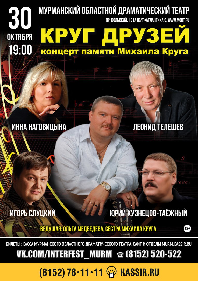 Концертное агентство Interfest представляет. В этому году легендарному музыканту и исполнителю Михаилу Кругу исполнилось бы 55 лет... В Мурманске пройдёт концерт его памяти, получивший название «Круг друзей».