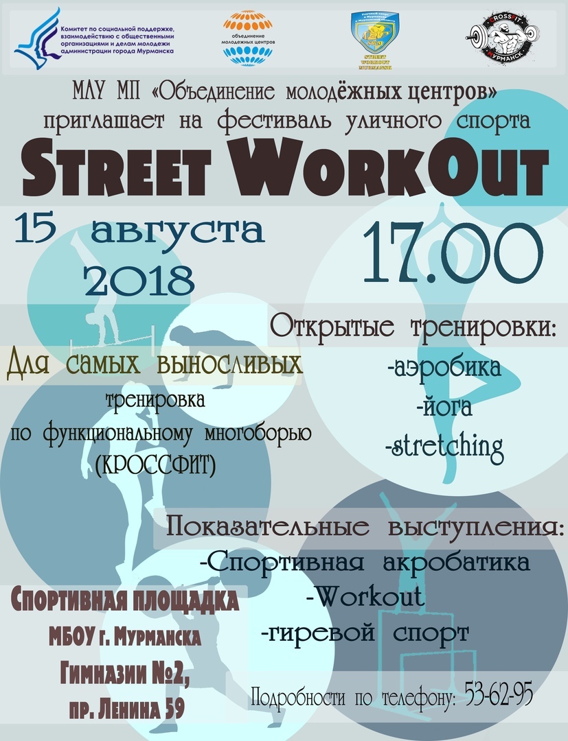 Workout заставит тебя забыть о комфортабельном помещении спортивного зала. Krossfit проверит насколько ты вынослив. Акробаты удивят тебя своей гибкостью. А мастера гиревого спорта продемонстрируют свою силу. Ты сможешь потренироваться в компании единомышленников. Открытые тренировки по йоге, аэробике, кроссфиту и стрейчингу.