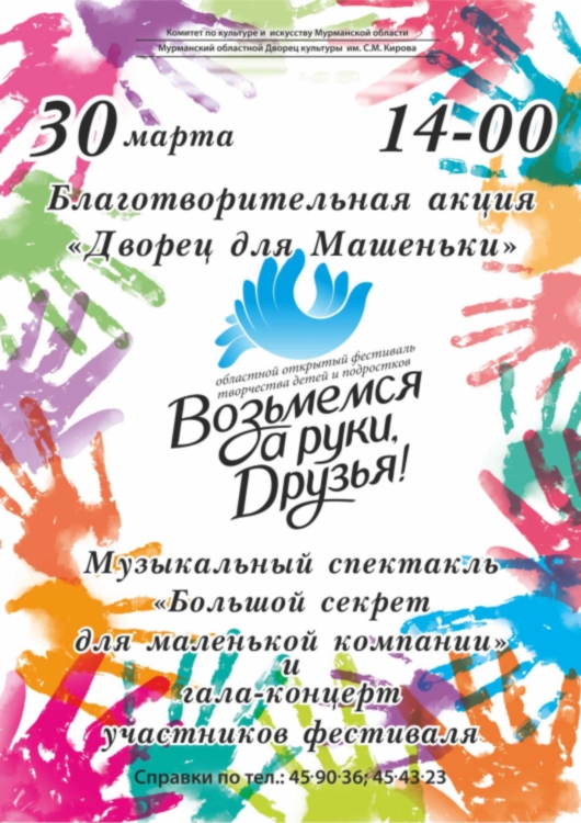 Во дворце установлена «урна» (№16) для сбора средств в поддержку Маняши. А 30 марта в Зрительном зале состоится гала-концерт областного фестиваля творчества детей и подростков с ограниченными возможностями здоровья.