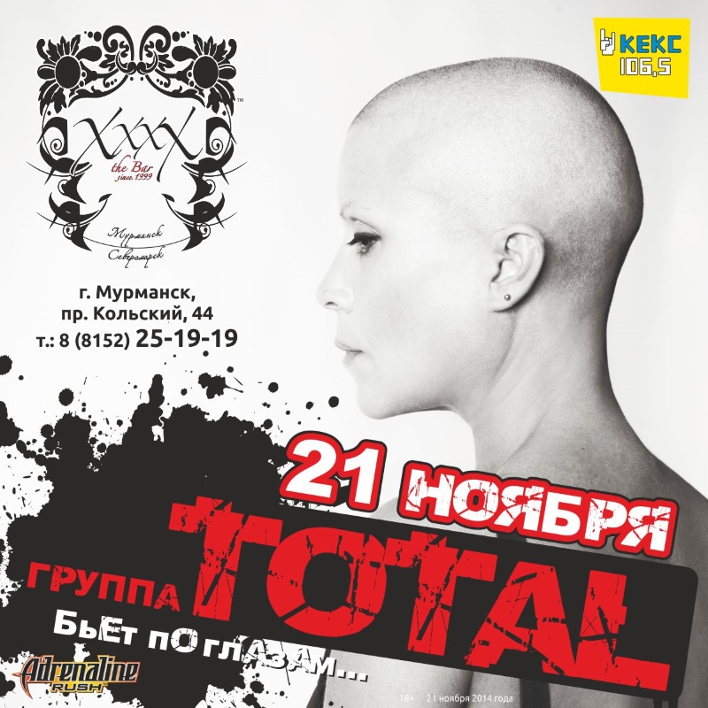 Группа TOTAL появилась в начале нулевых, благодаря продюсеру Максу Фадееву и взлетела на музыкальный Олимп с убойным хитом «Адреналин», который по сей день звучит в эфирах радиостанций. А на концертах публика тут же подхватывает: «Переживем, ну и черт с ним!». Первый альбом группы сводили звукорежиссеры «Rammstein», а первое выступление ТОТАЛ состоялось в «Олимпийском» на разогреве у Мэрилина Мэнсона. Шоу увидело 40 тысяч человек. Проехав по России и странам СНГ, записав второй альбом, группа взяла творческий тайм аут, связанный с семейными обстоятельствам.